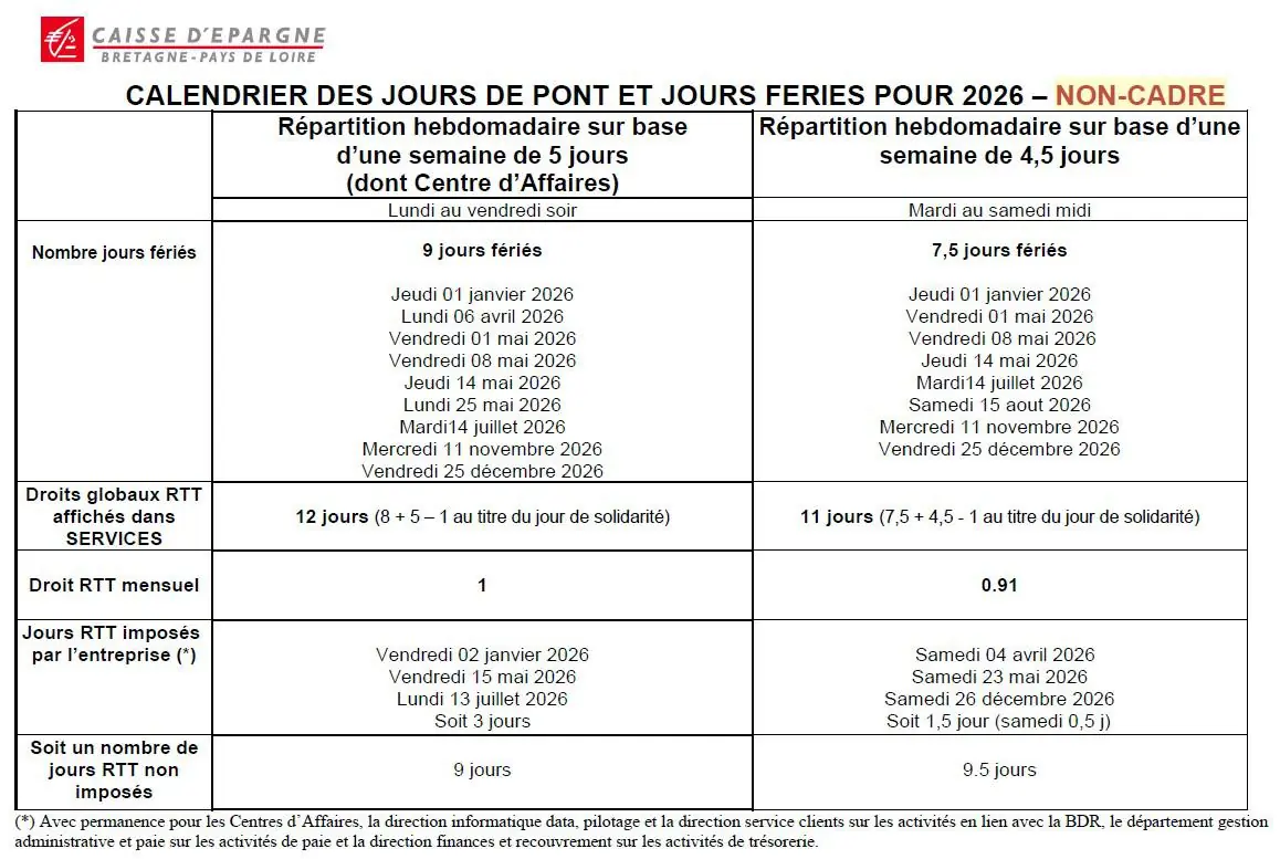 Calendrier PONTS & JOURS FERIES 2026 - NON CADRES