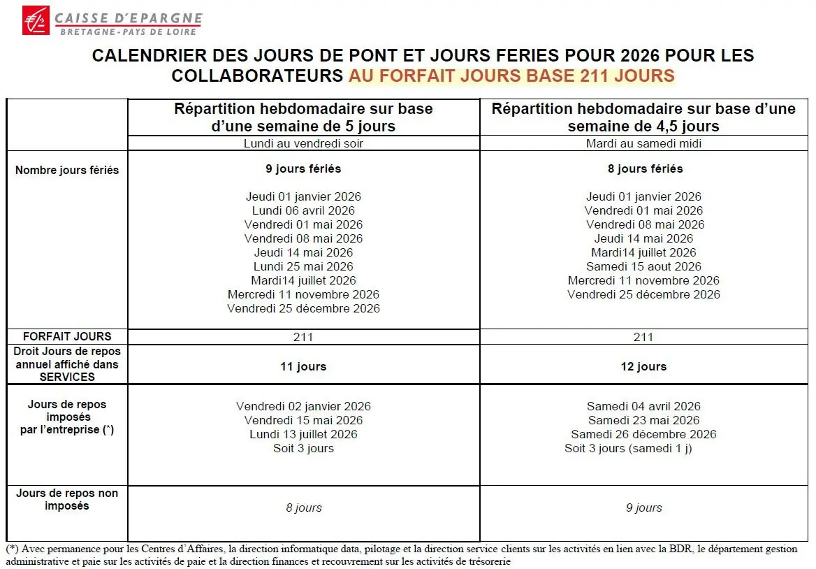 Calendrier PONTS & JOURS FERIES 2026 - Forfait 211 jours