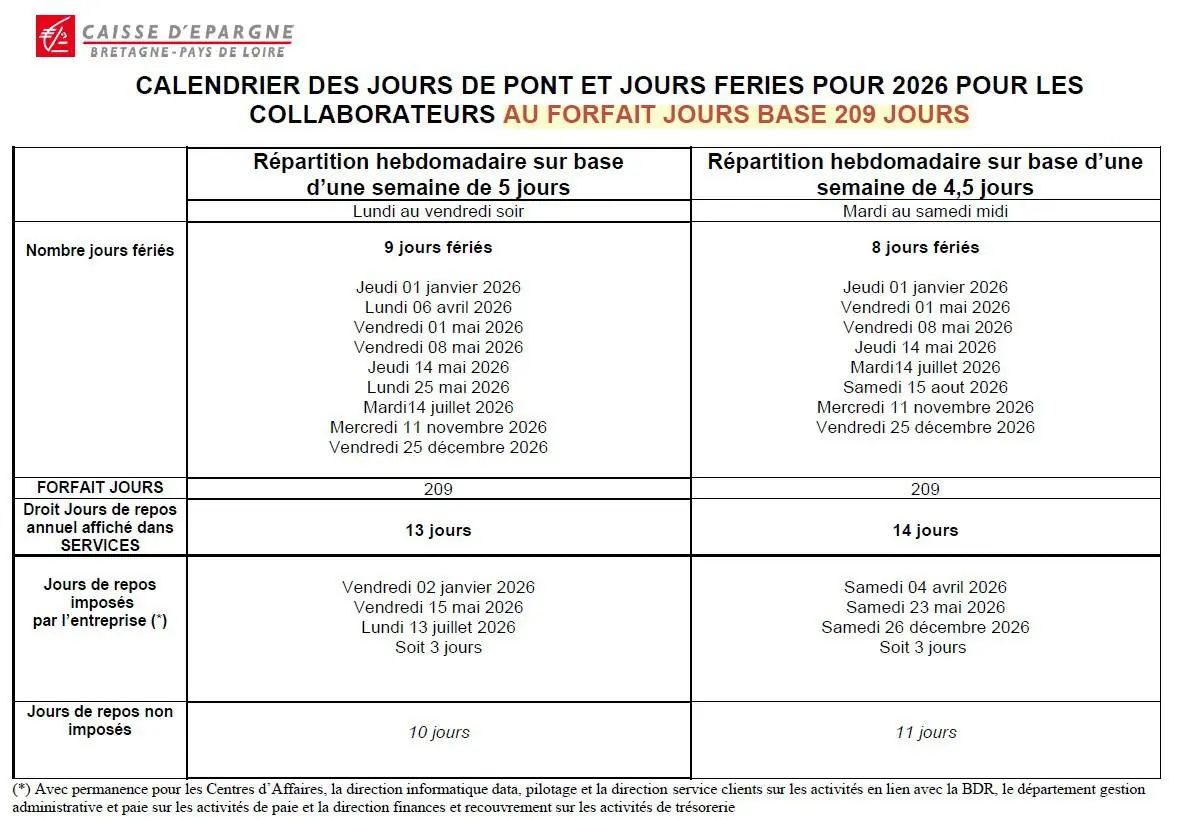 Calendrier PONTS & JOURS FERIES 2026 - Forfait 209 jours